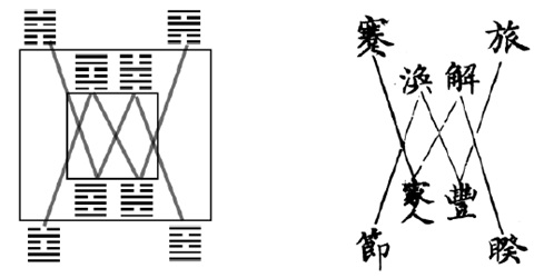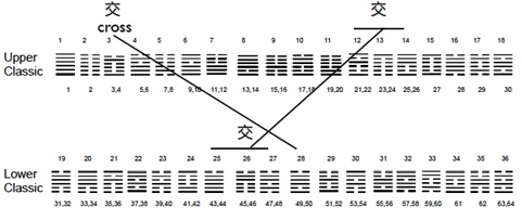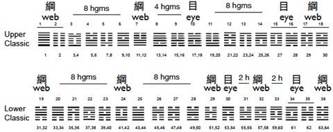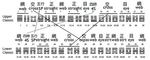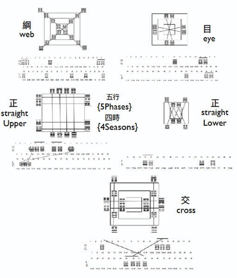 Ван также определил типы гексаграмм “прямая линия, чжэн 正”, противоположности - по 8 в каждой из двух подпоследовательностей последовательности Чжуйи, и 16 противоположностей “перекрестно—классическая цзяо 交”, по 8 в каждой подпоследовательности. Восемь оставшихся гексаграмм Ван рассматривал как два особых случая группы перекрестных подпоследовательностей и обозначил их как “Пять фаз (усин 五⾏)” и “Четыре времени года (сиси 四 時)”. Прямолинейные гексаграммы имеют свои противоположности в одной и той же подпоследовательности - либо в верхней, либо в нижней части. Проигравшая классика; противоположности перекрестных классических гексаграмм находятся в параллельной подпоследовательности. Термин ”цзин 經“, который стал означать ”Классический текст“ (как в 易經, Ицзин, Классика перемен), первоначально означал ”основу" тканого полотна. Выбор Вангом терминов, которые я перевожу как “паутина” и “глаз”, для обозначения основных категорий гексаграмм отражает этот текстильный образ. В нем верхняя и нижняя подпоследовательности представлены в виде двух наборов нитей основы с узорами, проходящими вдоль “прямых линий” и пересекающими их, образуя сетку. Ван отметил: “”Глаза" изображают то, что сплетает вместе две Ци в основе и утке, ⽬象經緯所以組織⼆氣也". (Ван, 14а). Таким образом, "глаза" представляют собой последовательность сама по себе имеет или является образом, и, по мнению Ванга, “с давних пор никто не говорил о последовательности гексаграмм в терминах общего образа, выражаемого последовательностью гексаграмм , 古未有以卦序之象⾔之者⾔卦序序” (Ванг, 1а).