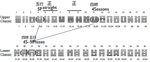 Это изображение связывает гексаграммы Ванга с 5 фазами (S4: H5 и 6) в прямолинейно противоположные отношения с соседними гексаграммами S5: H7 и 8 и S8: H13 и 14. Элемент с 5 фазами, противоположный S21: H35 и 36 лежат поперек подпоследовательностей в Нижней классической таблице. Однако Ван считает, что они связаны с Верхней классической таблицей отчасти потому, что они находятся среди 28 гексаграмм во внешнем квадрате матрицы 8 x 8. Участников 5 этапа группы также содержат элементные палиндромов среди их составных триграммы. Они сочетают в себе ☰, ☷, ☵, и ☲, и Ван звонки ☰ и ☷ “мастера (主-Чжу)” в Верхняя классическая. Это работает для Н7, 8, 13 и 14, которые находятся в Верхней классической, и он расширяет “мастерство” ☰ и ☷, чтобы они доминировали и в расположении Нижних классических гексаграмм 5 фаз. В этом свете “4 сезона” гексаграмм в S11: Н19, 20 и S20: отель h33, 34 входит ☷, ☴, и ☱ в бывшей и ☰, ☳, и ☶ в последнем. И снова приоритет , предоставленный мастер-триграммам, свидетельствует в пользу их принадлежности к Высшей классике в представлении Вана.