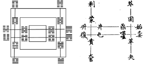 Обращаясь к квадратному массиву Шао Юна, Ван начинает с визуальной презентации, в которой используются названия гексаграмм, показанные в виде массива 8 х 8 справа внизу. Я перевожу эту и другие его графики в линейные гексаграммы, как показано здесь слева: (12)