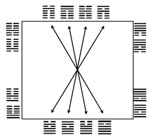 На самом деле, линейные противоположности этих гексаграмм расположены по диагонали поперек массива 8 х 8, как показано на рисунке с восемью гексаграммами вверху и внизу:
