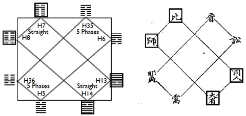 Это изображение связывает гексаграммы Ванга с 5 фазами (S4: H5 и 6) в прямолинейно противоположные отношения с соседними гексаграммами S5: H7 и 8 и S8: H13 и 14. Элемент с 5 фазами, противоположный S21: H35 и 36 лежат поперек подпоследовательностей в Нижней классической таблице. Однако Ван считает, что они связаны с Верхней классической таблицей отчасти потому, что они находятся среди 28 гексаграмм во внешнем квадрате матрицы 8 x 8. Участников 5 этапа группы также содержат элементные палиндромов среди их составных триграммы. Они сочетают в себе ☰, ☷, ☵, и ☲, и Ван звонки ☰ и ☷ “мастера (主-Чжу)” в Верхняя классическая. Это работает для Н7, 8, 13 и 14, которые находятся в Верхней классической, и он расширяет “мастерство” ☰ и ☷, чтобы они доминировали и в расположении Нижних классических гексаграмм 5 фаз. В этом свете “4 сезона” гексаграмм в S11: Н19, 20 и S20: отель h33, 34 входит ☷, ☴, и ☱ в бывшей и ☰, ☳, и ☶ в последнем. И снова приоритет , предоставленный мастер-триграммам, свидетельствует в пользу их принадлежности к Высшей классике в представлении Вана.