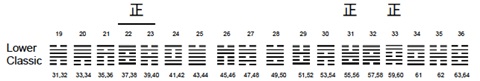 Противоположности “прямолинейных” гексаграмм встречаются в одной и той же подпоследовательности Чжоуи, верхней или нижней. Ван показывает этот класс гексаграмм (выделенных для наглядности вставками) для верхней части Таким образом, классические гексаграммы находятся во внешнем кольце матрицы 8 х 8: