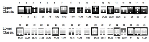 Однако он помещает оставшиеся комбинации ☰ и ☷ (т.е. S13; H23 и 24 и S25: Н43,44 относятся к числу “перекрестно-классических противоположностей”, как мы увидим ниже, и основывают свое объяснение на их семиотических триграммах, а не на палиндромных. ☳ и ☶, которые являются янскими и "небесными" (14) , составляют S13; H23 и 24 находятся в Верхнем классическом положении; ☴ и ☱ находятся в местах S25: H43,44 в Нижнем. (Ван, 21б). Однако, если нас интересуют только визуальные группировки, а не имажинистические аргументы, мы можем отметить, что главными классическими прямолинейными противоположностями являются сгруппированы с парой гексаграмм 5 фаз на одном конце и гексаграмм 4 сезонов на другом, разделенных парой из сетки и рамки для глаз (S10). С этой точки зрения предположение о том, что конфигурация гексаграммы, найденная Ваном в матрице 8 х 8, также сгруппирована в Чжоу и, заслуживает доверия. Все восемь нижних классических прямолинейных противоположностей находятся в центральном кластере матрицы 8 x 8 и распределены таким образом в системе Чжуйи.: