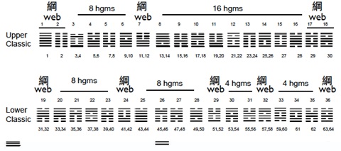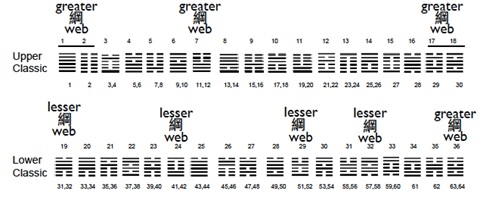 “Большие сети" - это 8 гексаграмм в S1 ䷀, 2 ䷁, 7 ䷊ ䷋, 17 ䷜, 18 ䷝, и 36 ䷾䷿. Они состоят только из палиндромных триграмм ☰, ☷, ☵, ☲, либо только в S1, 2, 17, 18, либо в комбинации в S7 и 36. В этих парах каждая гексаграмма-член находится в паре со своей соседкой и напротив нее. (В обобщенном представлении S7 - это две гексаграммы H11 ䷊ и H12 ䷋, а S36 - это H63 ䷾ и 64 ䷿. H11 и 12 образуют противоположную друг другу самардную пару, как и 63 и 64.) 8 Гексаграммы меньшего типа противостоят друг другу на расстоянии в парах датчиков: пара на S18 (Сайт H31 ䷞ и 32䷟) напротив, что в " на " S24 (H41 ䷨ и 42 ䷩) и S29 (H51 ䷲ и 52 ䷳) является напротив С32 (Н57 ䷸и 58 ䷹). Типы “малой паутины” включают в себя семиугольные триграммы θ, двойные числа 29 и 32 или в сочетании с противоположной триграммой S19 и 24.