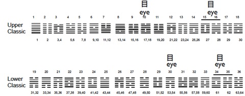 "Глаза" состоят из двух противоположных пар соседних палиндромов — S16 и 17 и S34 и 35 — и двух пар сенсоров, которые противоположны друг другу: S10, что означает "°" и "°", и S30, "°" и "°". У каждого из этих последних есть только семисоставные триграммы, отличающие их от остальных "группа "Веб". Гексаграммы глаз расположены ближе к концам соответствующих им подпоследовательностей, разделенных 8 гексаграммами в верхней части и 6 - в нижней. В матрице 8 x 8 гексаграммы глаз в одной и той же последовательности расположены в третьем кольце от центра. Верхняя классическая H17 сочетается с H28 и H18 с H27; Нижний классический H53 сочетается с H62, а H54 - с H61. В совокупности структура полотна и глаза поддерживает расстояние между гексаграммами в 2 базовых числа, наблюдаемое среди приведенных выше гексаграмм полотна: