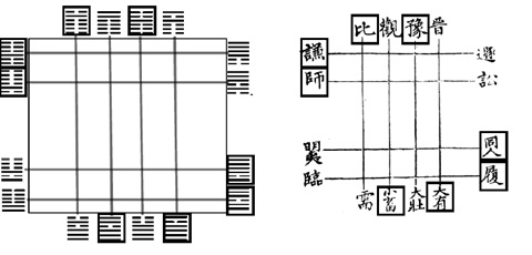 18) В "Чжоули" 周禮 упоминаются два других ордена — ляньшань 連⼭ и гуйцзан 歸藏, которые использовались на протяжении 18 с Чжуйи придворными прорицателями. (Шульц, 2011, стр. 640-41) Существуют только предполагаемые фрагменты из них. 卦 氣圖 гуакиту, альманах гексаграмм, представленный в сезонном порядке, связан с эпохой Мэн Си 孟喜 (2 век до н.э.?), но может использоваться и дольше. (Шульц и Каннингем, 1990). Еще одним традиционным порядком, который, по-видимому, сохранился со времен ранней Хань и неизвестного происхождения, является матрица багонг ⼋宮 (Schulz, 2016, 32-33), который до сих пор широко используется в гадании по линии хуочжулинь ⽕珠林.